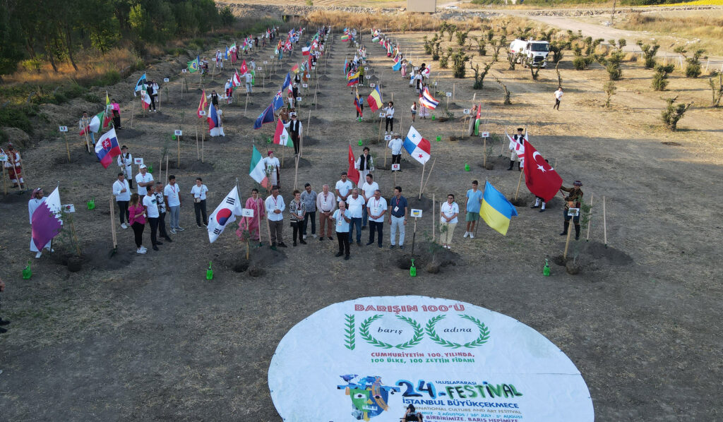 24. Uluslararası İstanbul Büyükçekmece Kültür ve Sanat Festivali’ne 100 ülkeden katılan 1550 kültür ve sanat elçisi  dünya barışı için 100 zeytin ağacını toprakla buluşturdu.