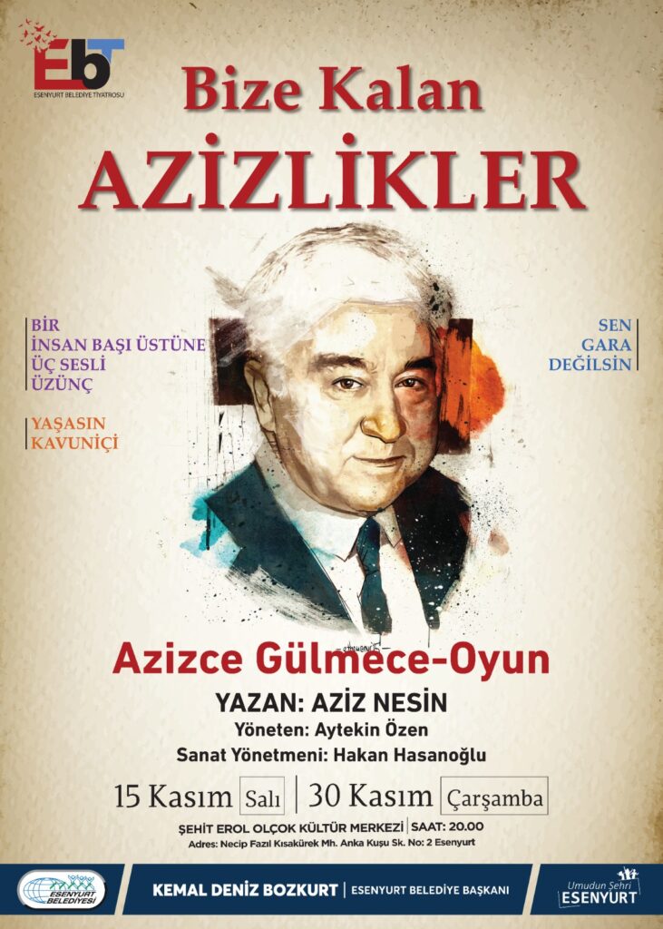 Esenyurt, sanat ile anılmaya devam ediyor. Başarılı kadrosuyla birbirinden güzel oyunları seyircilerle buluşturan Esenyurt Belediye Tiyatrosu, 15 Kasım’da Aziz Nesin’in eserlerini sahneleyecek.