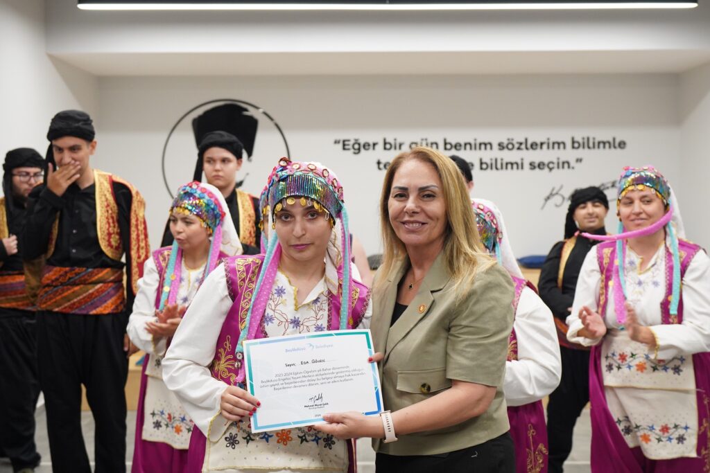 Merkezde gerçekleştirilen törene bu yıl yaklaşık 50 öğrenci katıldı. İki saat süren etkinlikte, ismi anons edilenler alkışlarla sahneye çıktılar ve karnelerini alıp, hatıra fotoğraflarını çektirdiler. Öte yandan engelsiz yaşam merkezi öğrencileri tarafından halk oyunu gösterisinde hünerlerini sergileyen öğrenciler ise güne renk kattılar.