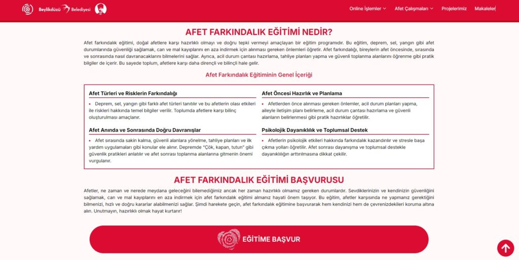 Beylikdüzü Belediyesi, yenilenen platform üzerinden toplumsal dayanışmayı da güçlendirmeyi amaçlıyor. Eğitimlerin yanı sıra bilgilendirme seminerleri ile de vatandaşlar, olası afet durumlarına daha bilinçli ve hazırlıklı hale geliyor. Ayrıca, site üzerinden yapılacak duyurular ve güncellemeler, afet anında doğru ve hızlı bilgiye erişimi kolaylaştırıyor. Öte yandan Beylikdüzü Belediyesi tarafından “İlk Yardım Eden Sen Ol” projesine de site üzerinden ulaşılabiliyor. Proje kapsamında, vatandaşlara ilk yardım farkındalık eğitimi verilerek, afet ve acil durumlarda etkili müdahalede bulunma imkanı sunuluyor. Eğitime katılmak isteyenler, https://hazir.beylikduzu.istanbul/ilk-yardim-farkindalik-egitimi adresinden online kayıt yapabiliyor.