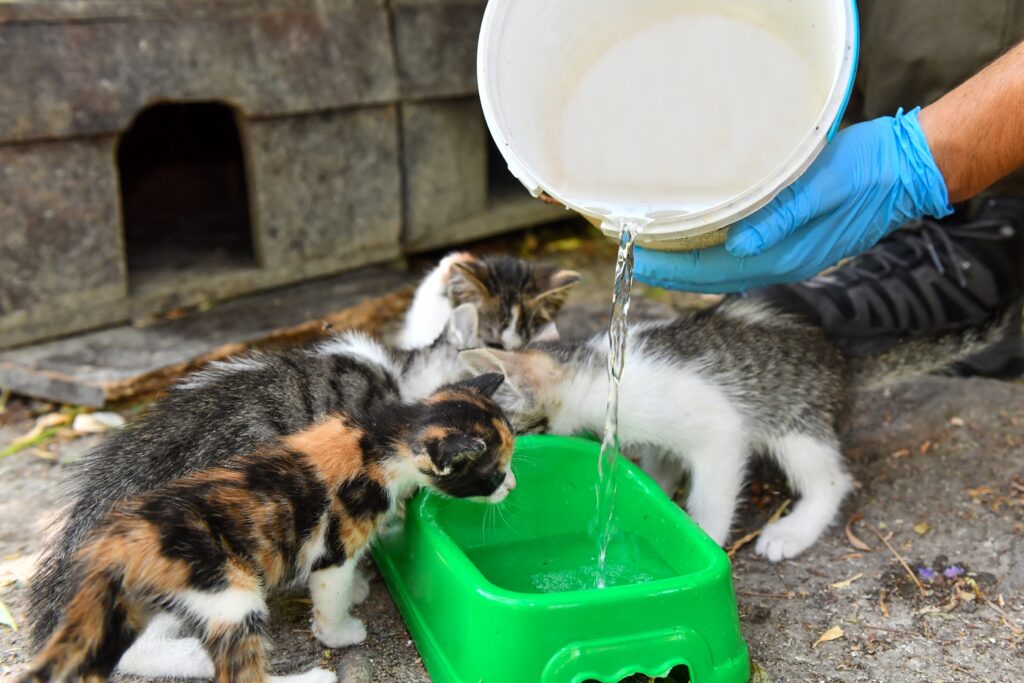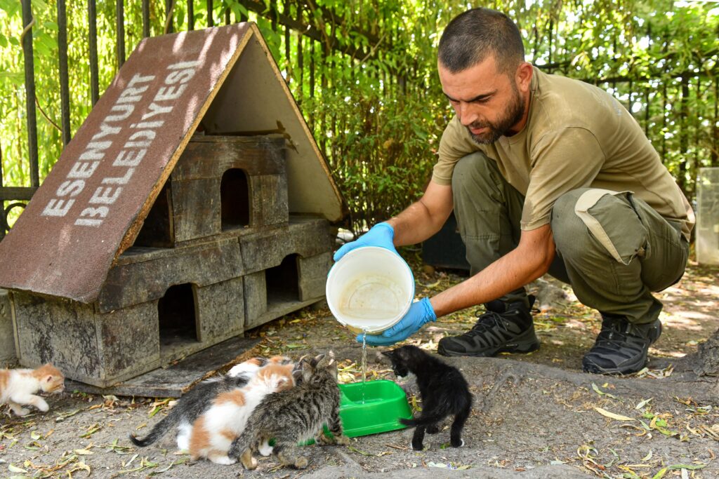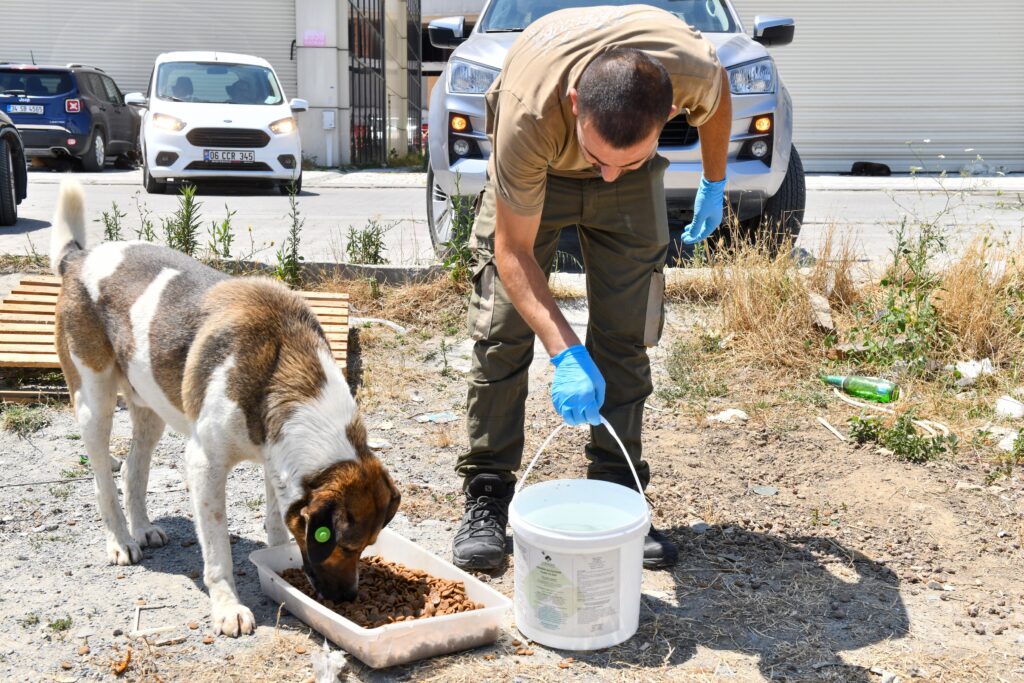 Artan hava sıcaklıkları nedeniyle sokak hayvanlarının susuz kalmaması için seferber olan Esenyurt Belediyesi ekipleri, besleme noktalarına su ve mama takviyesi yapıyor.