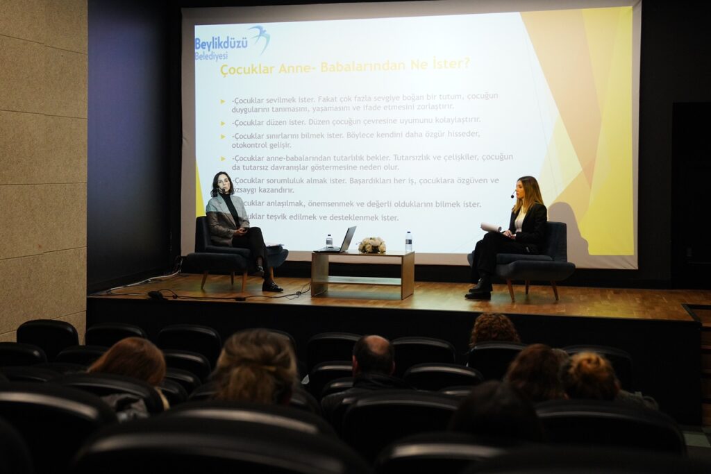 Çocukların yanı sıra ebeveynlere yönelik de farkındalık yaratacak etkinlikler düzenleyen Beylikdüzü Belediyesi, Yuvamız Beylikdüzü Hüseyin Tütüncü Gündüz Çocuk Bakımevi ile Şehit Öğretmen Şenay Aybüke Yalçın Gündüz Çocuk Bakımevi öğrencilerinin ebeveynlerini “Aile içi iletişim” seminerinde bir araya getirdi. Beylikdüzü Atatürk Kültür Merkezi’nde gerçekleşen seminerde gündüz çocuk bakımevlerinden sorumlu uzman klinik psikologlar Tuğçe Seçkin Esmeray ve Dilek Aybike Güder aile içi iletişimi; empati, ebeveyn tutumları, aktif dinleme ve ben dili başlıkları altında ele aldı. Farkındalığı artıracak paylaşımların yapıldığı programda ebeveynler de çocuklarıyla olan deneyimlerini paylaştı.