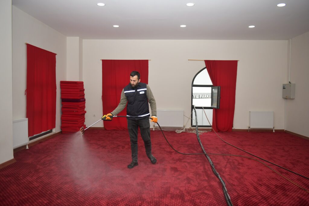 Kış ayarında artan salgın hastalık riskine karşı da önlemler alan ekipler dezenfekte çalışması yaparak ibadet mekanlarını tamamen hijyenik hale getiriyor.