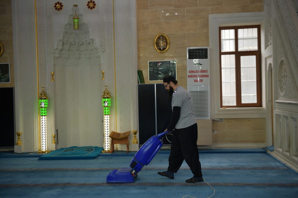 Vatandaşların ibadetlerini daha temiz ve sağlıklı bir ortamda yapabilmeleri amacıyla çalışan ekipler halıları yıkıyor, camları siliyor, avluları tazyikli suyla yıkayarak toz ve kirden arındırıyor.