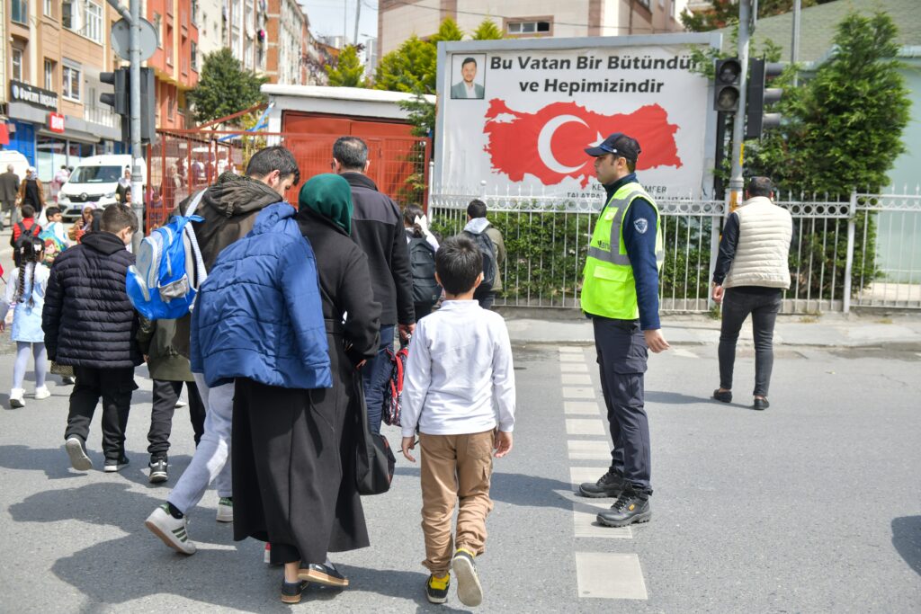Esenyurt zabıtası, okul giriş ve çıkış saatlerinde trafiği kontrol altına alarak, öğrencilerin güvenli geçişini sağlıyor.