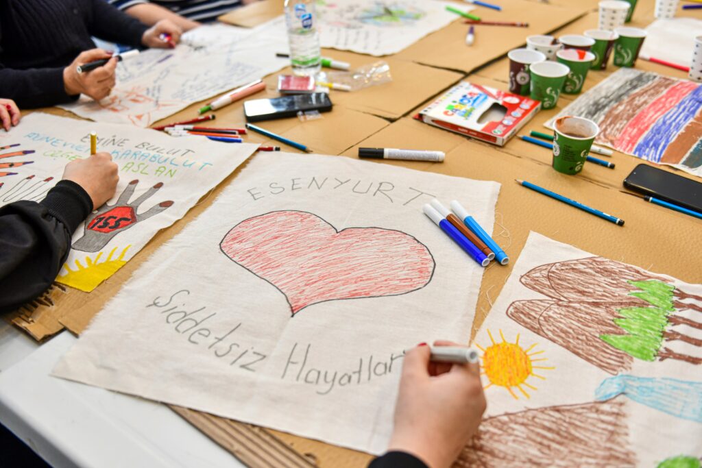 Esenyurtlu kadınlar, kadına yönelik şiddete karşı farkındalık oluşturmak amacıyla düzenlenen etkinlikte, çizdikleri resimlerle şiddete karşı tepkilerini ortaya koydu.