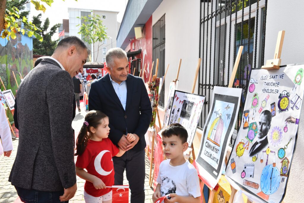 Başkan yardımcıları ve müdürler, özgün ve grup çalışmalarından oluşan tabloları tek tek inceleyerek çocukları tebrik etti. Atatürk’ten ne istersin diye sorulan miniklerden kimisi, “Çikolata, şeker, bisiklet” derken kimisi de “Evimize gelmesini, fotoğraf çekilmek isterdim” diye belirtti.