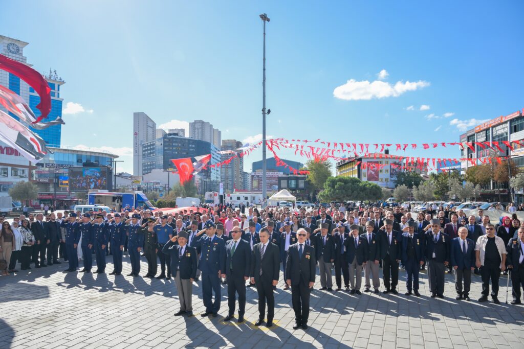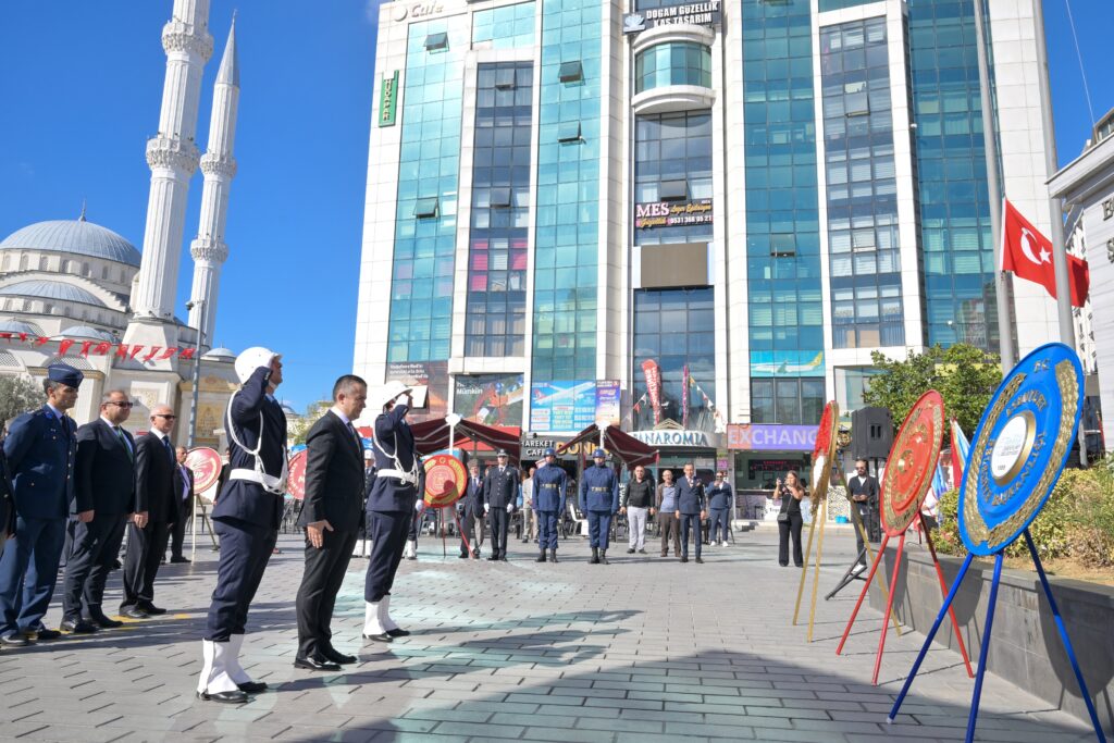 Yürüyüşün sonunda Cumhuriyet Meydanı’nda yapılan törene geçildi. Törenin ilk bölümünde, Esenyurt Kaymakamı Fatih Çobanoğlu, Garnizon Komutanı Albay Tufan Koç ve Belediye Başkan Vekili Can Aksoy, Atatürk Anıtı’na çelenk sundu.