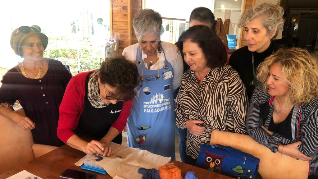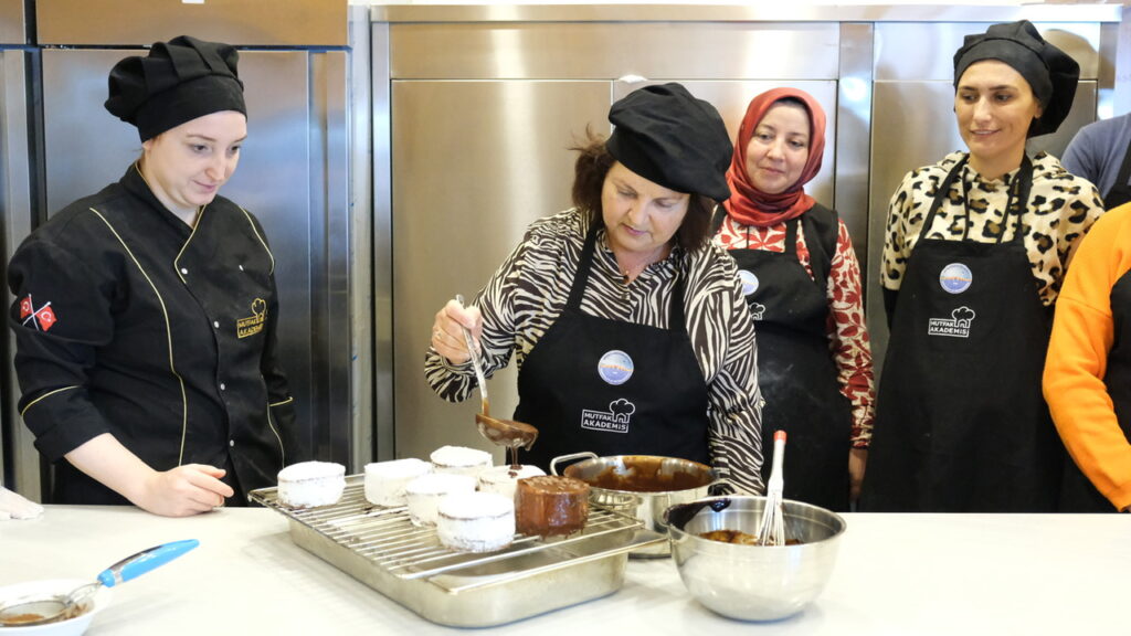 Büyükçekmece’de Değirmenpark, Güzelce Sanat Merkezi ve Mimaroba Halide Edip Adıvar Eğitim ve Sosyal Tesisleri’nde ahşap boyama, iğne oyası, deri keçe, kadın giyim dikiş, kumaş boyama, Meksika nakışı, amigurumi, takı tasarım, tel kırma, kırkyama, su kabağı işlemeciliği, kanaviçe, örgü, aşçı ve pastacı çıraklığı gibi farklı branşlarda eğitim alan kursiyerlerin talep ve önerilerini dinleyen Büyükçekmece Hatice Akgün, Mutfak Akademisi’nde kursiyerlerle birlikte çikolata ve pasta yaptı.