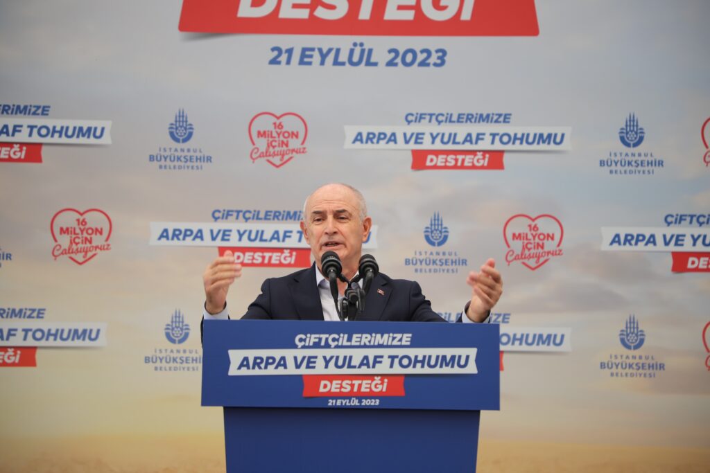 Arpa – Yulaf tohumu dağıtımtöreninde konuşan İstanbul Büyükşehir Belediye Başkanı Ekrem İmamoğlu,En başından beri temel amacının 16 milyon insana eşit hizmet sunmak olduğunu belirterek şunları söyledi: “Aynı zamanda tüm ihtiyaçlarını karşılayan, bir eksik bırakmadan onların taleplerini inceleyen, insanlarımızın ihtiyaçlarına katkı sunmak. Bu şehirde yaşayan insanlara saygı göstererek hizmet sunmayı elbette çok önemsiyorum. Şehrimizin yeşil alanlarından sosyal desteklere, altyapı yatırımlarından kentsel dönüşüme varıncaya kadar insan hayatına dokunan bütün hizmetleri yerine getirme konusunda çözümler ürettik, projeler ürettik. Vatandaşlarımızın sıkıntı duyduğu her konuya da destek olduk. Ekonomik krizin derinden etkilediği, çiftçilerimizin çiftçilik yapmayı bıraktığı dönemde biz İstanbul’un tarımsal alanlarını nasıl güçlendirebiliriz, çiftçilik yapmak isteyen, İstanbul’un topraklarını yeşertmek isteyen hemşerilerimize ‘’Biz buradayız’’ diyerek İstanbul Büyükşehir Belediyesi olarak 2020 yılından bu yana İstanbul’un çiftçilerine destek olmaya başladık. En çok gururlandığımız hizmetlerden birisini İstanbul’da hayata geçirdik. Gerçekten mutluyuz, onurluyuz ve gururluyuz. Göreve geldiğimiz günden bu yana yazlık fide sebzesi ve özellikle buna benzer desteklerle başladığımız süreç artık kışlık fide desteğine, yağlık ayçiçeği tohumundan silajlık mısır tohumuna, ekmeklik buğday tohumu dağıtımıyla beraber sürdü. Hiçbir alanda eksik varsa o alanda boş bırakmamaya, gübreden mazota, balıkçılarımıza desteklerimizden koruyucu ekipmanlarına, kuzu besi yeminden arı yemine varıncaya kadar her detaya katkı sunmaya gayret ettik. Biliyoruz ki tarımla uğraşan vatandaşlarımızın özellikle girdi maliyetlerinin karşılanması hususu onların hayatlarını devam ettirmesi konusunda önemli bir ihtiyaç. Bugün verdiğimiz desteklere bir yenisini daha ekliyoruz. İstanbul’da 1982 çiftçimize 20 milyon liraya yakın maliyetle arpa ve yulaf tohumu dağıtımı yapıyoruz. Hayırlı olsun. Bugünkü çiftçilere dağıtacağımız tohumların onlara bol bereket getirmesini diliyorum.’’