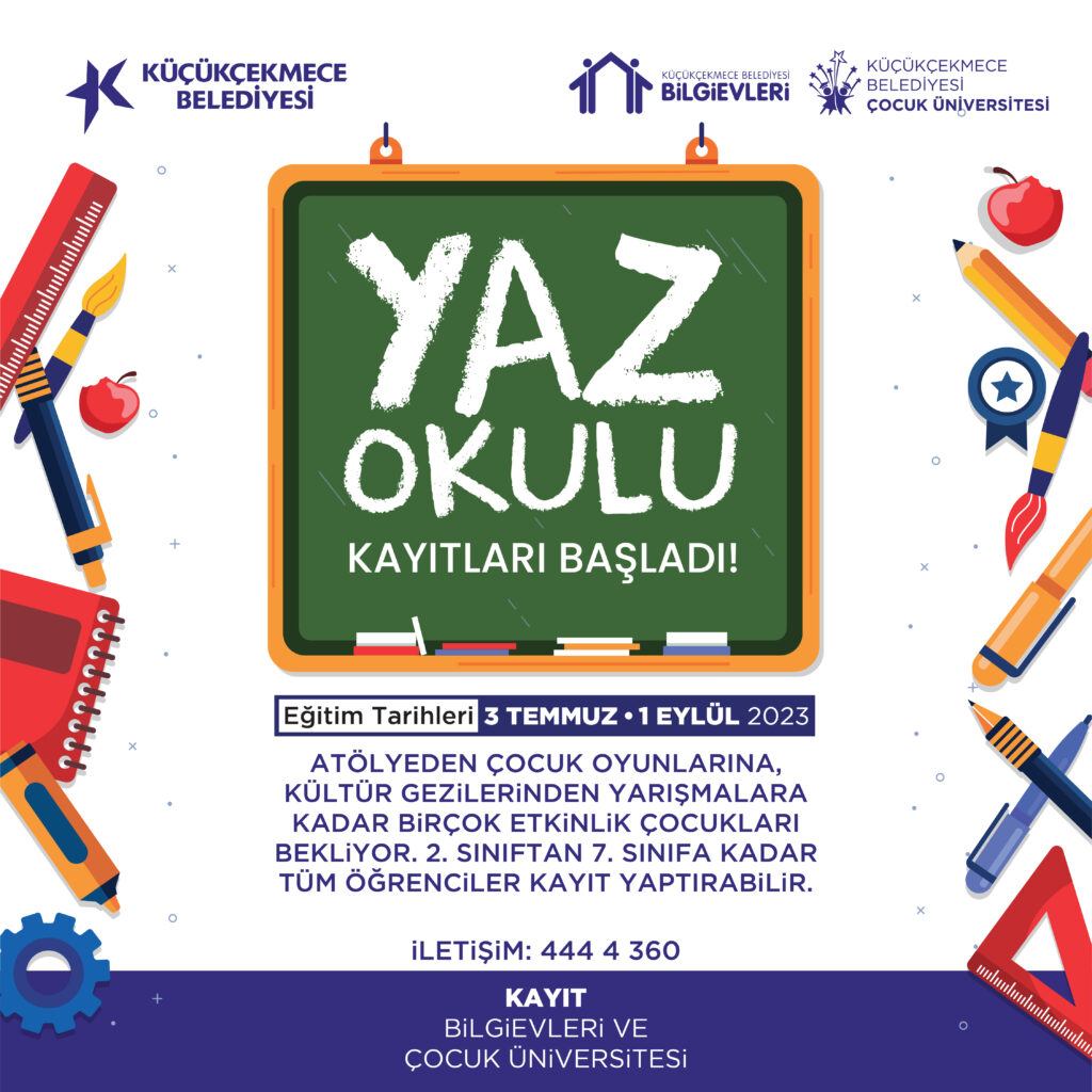 Yaz okullarına kayıt yaptırmak isteyenler, Küçükçekmece’deki Bilgievleri veya Çocuk Üniversitesi’ne başvurabilir; 444 4 360 numaralı telefondan bilgi alabilir.