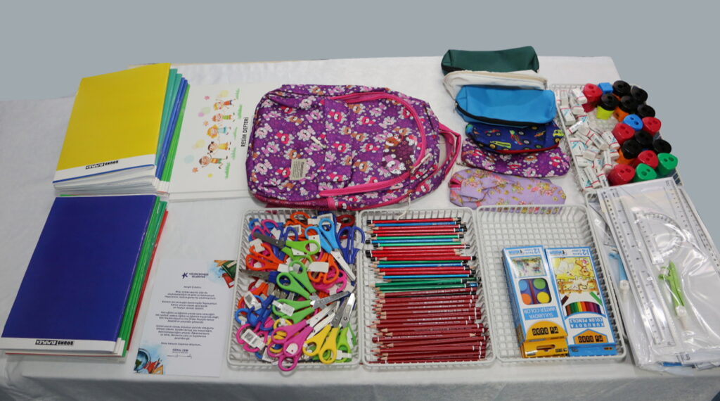 Kırtasiye setinin içerisinde; çanta, kalem kutusu, makas, kurşun kalem, suluboya, defter, silgi, kalemtıraş ve cetvel seti gibi öğrencilerin temel ihtiyacı olan ürünler bulunuyor.