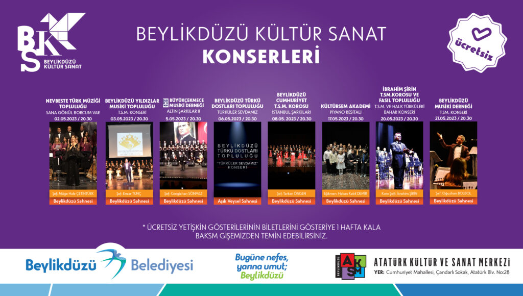 Mayıs ayı kültür ve sanat etkinlikleri kapsamında düzenlenecek konserlerde ise 5 Mayıs’ta Büyükçekmece Musiki Derneği, 8 Mayıs’ta Beylikdüzü Cumhuriyet Türk Sanat Müziği Korosu, 17 Mayıs’ta Kültürsem Akademi Piyano Resitali, 20 Mayıs’ta İbrahim Şirin Türk Sanat Müziği Korosu ve Fasıl Topluluğu, 21 Mayıs’ta ise Beylikdüzü Musiki Derneği’nin Türk Sanat Müziği Korosu sevenleriyle Beylikdüzü Sahnesi’nde buluşacak. Beylikdüzü Türkü Dostları Topluluğunun düzenleyeceği ‘Türküler Sevdamız’ konseri ise 6 Mayıs’ta Aşık Veysel Sahnesi’nde yapılacak.