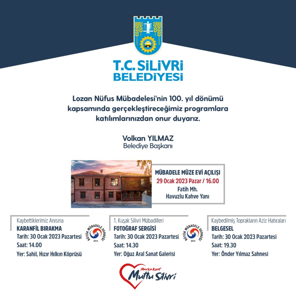 İstanbul Valiliği ve Silivri Belediyesi iş birliğiyle yapımı tamamlanan Mübadele Müze Evi, 29 Ocak 2023 Pazar günü hizmete açılıyor. Silivri Belediye Başkanı Volkan Yılmaz’ın ev sahipliğinde düzenlenecek olan törene; Kültür ve Turizm Bakanı Mehmet Nuri Ersoy ve İstanbul Valisi Ali Yerlikaya’nın katılması bekleniyor.