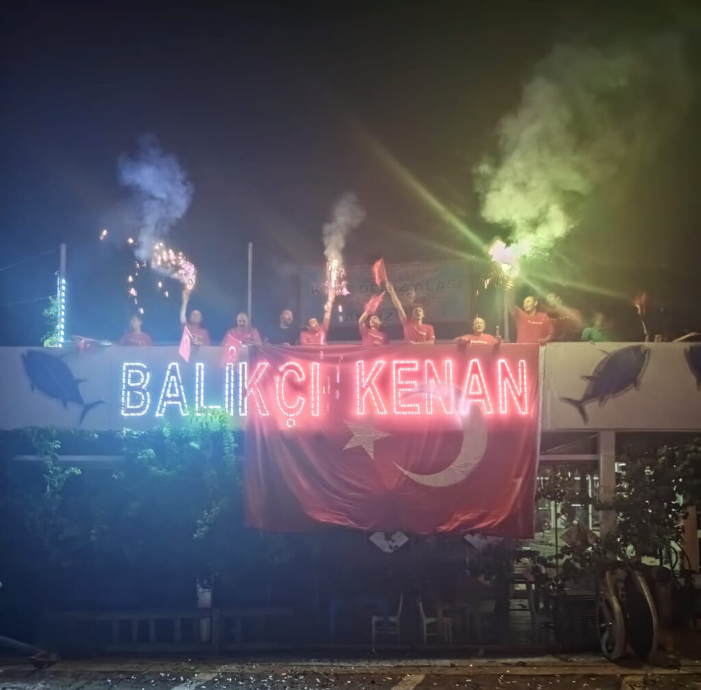 Türkiye’nin şerefine. Milli Takım’ın şerefine. Türk Bayrağı’nın göklerde dalgalanmasının şerefine. Balık ekmek içecekle beraber 120 lira. Yanında soğuksu ikram. Çaylarda şirketten diyen Türkiye Deniz Canlıları Müzesi kurucusu Balıkçı Kenan Balcı, herkesi balık yemeye davet etti.